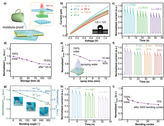 在本研究中,李顺心课题组构建的光电探测器通过“光转换–光捕获–光电转换”的三重协同效应,实现了钙钛矿光电探测器在近红外波段的高性能探测与优异稳定性。其中,UCNP 负责将 980 nm 近红外光上转换为可见光,双纳米光栅结构进一步增强光吸收,PDMS 封装则显著提升环境与机械稳定性。基于该策略,器件在 980 nm 条件下实现了 2.9 A·W⁻¹ 的响应度和 1.34 × 10¹¹ Jones 的探测率,并在空气中存放 4 个月及经历 3000 次弯折后分别保持 78.6% 与 72.4% 的性能,为柔性近红外传感与多功能光电集成系统的发展提供了可行路径。